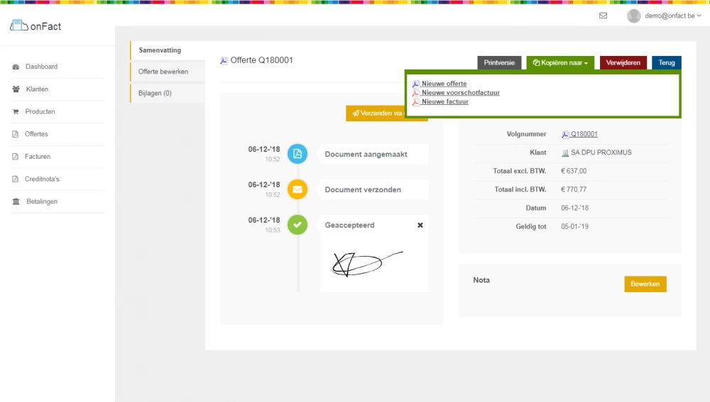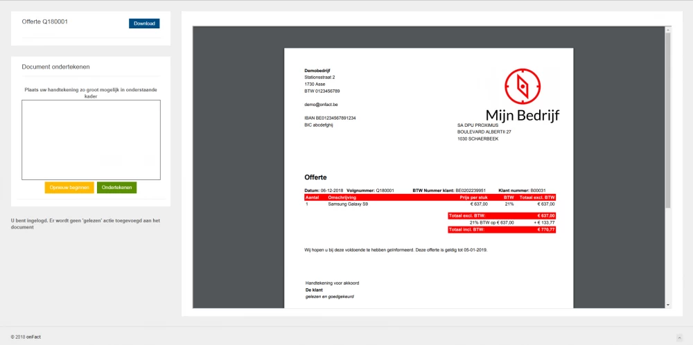 Your customers can approve your quotes online. They place their signature with the mouse and you are immediately notified by email. By making it easier to accept a quote, customers are quicker to approve an assignment and you always have proof in case of dispute!